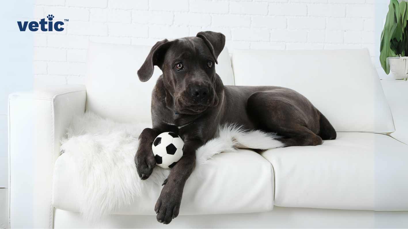 The image features a dark-colored junior dog, a Cane Corso, lying on a white sofa. The dog is holding a small black and white soccer ball with its front paws. A fluffy white rug or blanket is under the dog, adding contrast to its dark fur. In the background, there’s a white brick wall and part of a green plant visible on the right side of the image. Adopting a Cane Corso in India can be difficult considering where you live and how pet friendly how neighbours are.