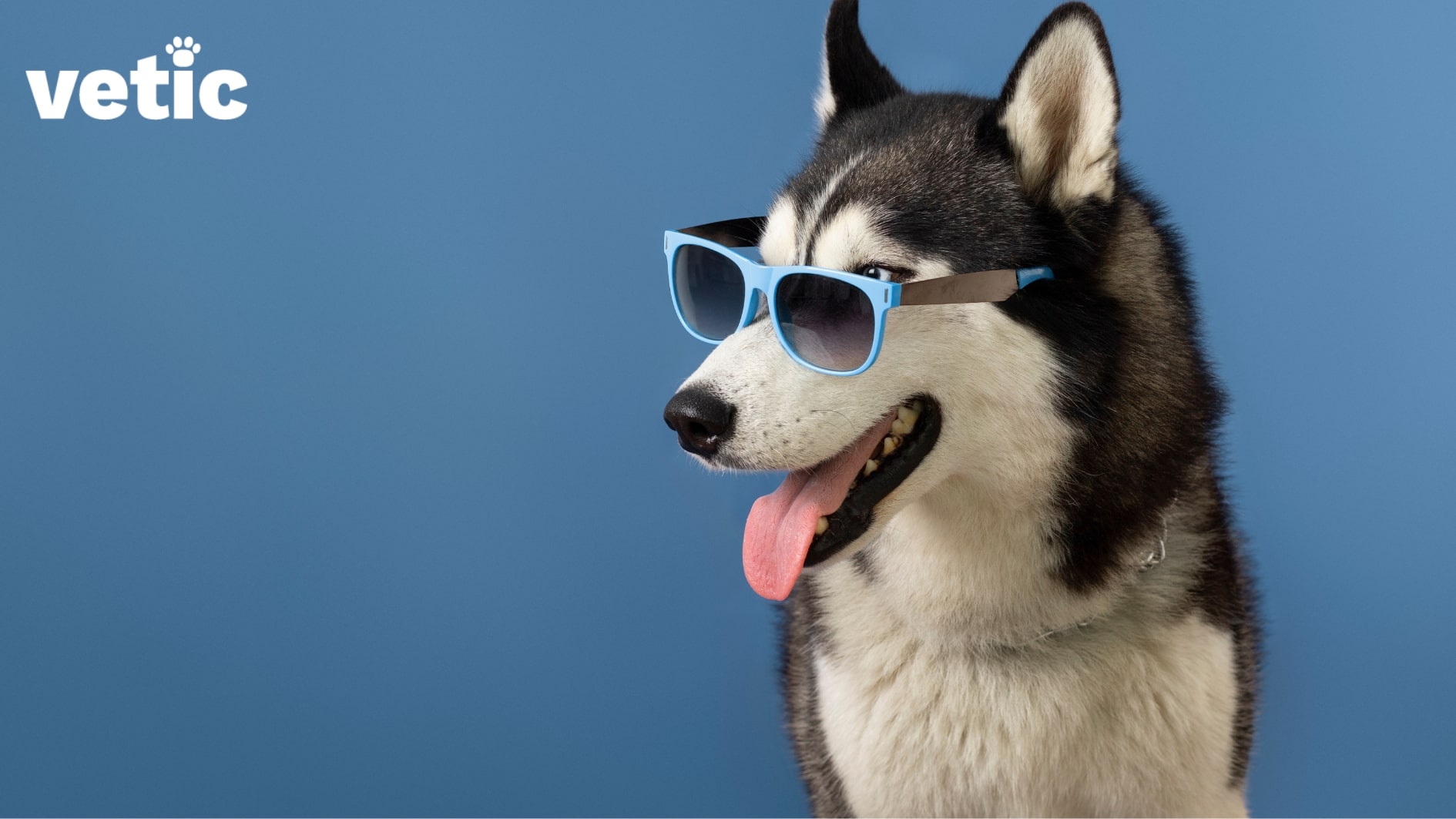 A black and white husky with blue eyes wearing a blue-framed sunglasses sitting in front of a blue background. Huskies in India need protection from the heat and humidity. Always leave the AC on during the day if you are leaving for work.