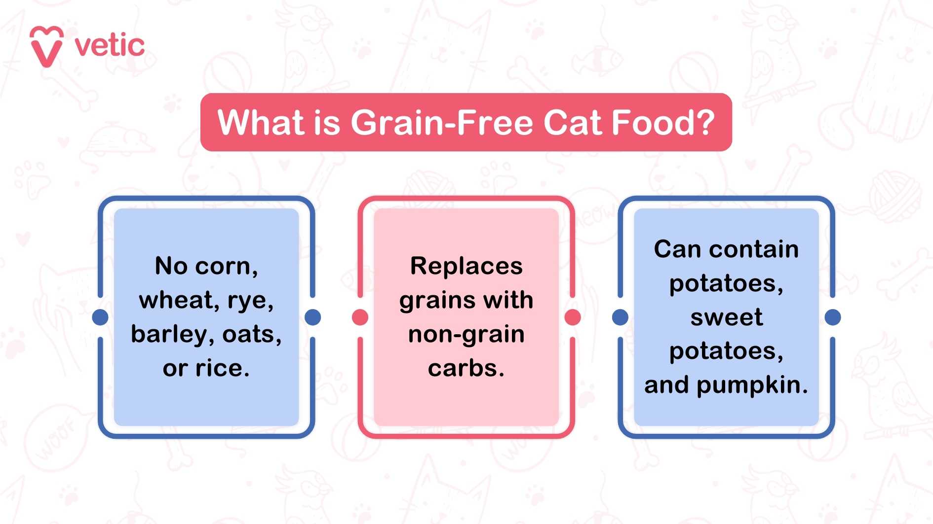 Grain-free cat food contains no grains like wheat, corn, or rice. Instead, it uses starchy vegetables or legumes as carbohydrate sources.