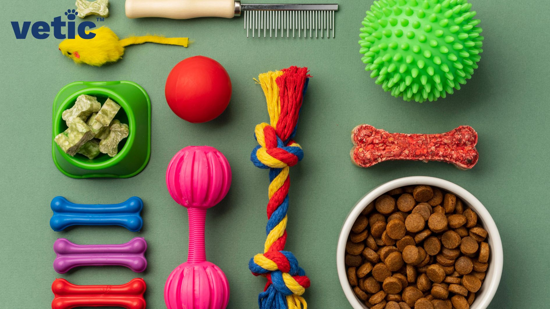 an assortment of dog accessories against a moss green background and a small white bowl of dog kibbles in the right hand bottom corner. the accessories include a green spiked chew ball, a processed chew bone, a multi-colored rope toy, a pink dumbbell, 3 latex bones in blue, purple and red, a small green bowl of bone shaped treats, a small red ball, a furry yellow mouse and a steel comb.