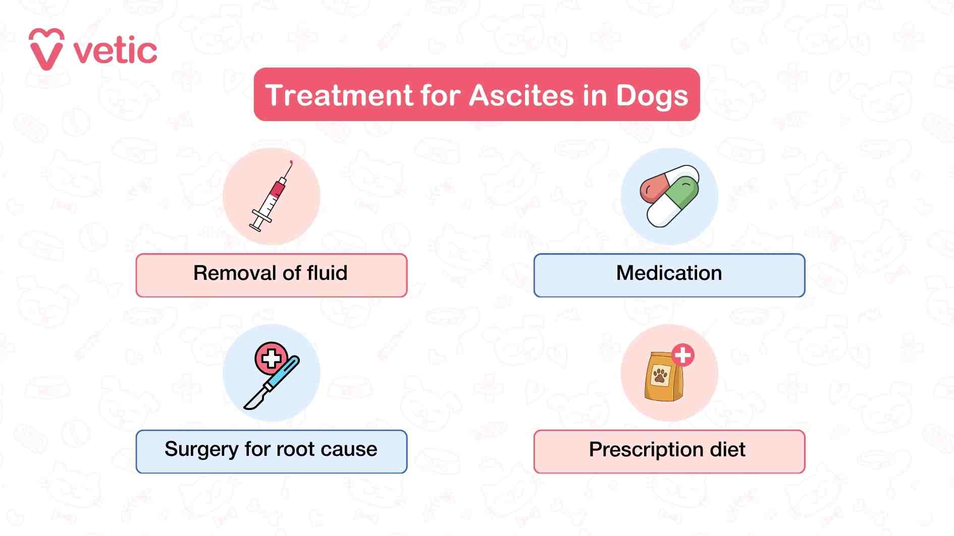 Your vet may drain some of the fluid to relieve pressure on the lungs and organs. However, this is a temporary measure—it doesn’t cure the underlying problem.