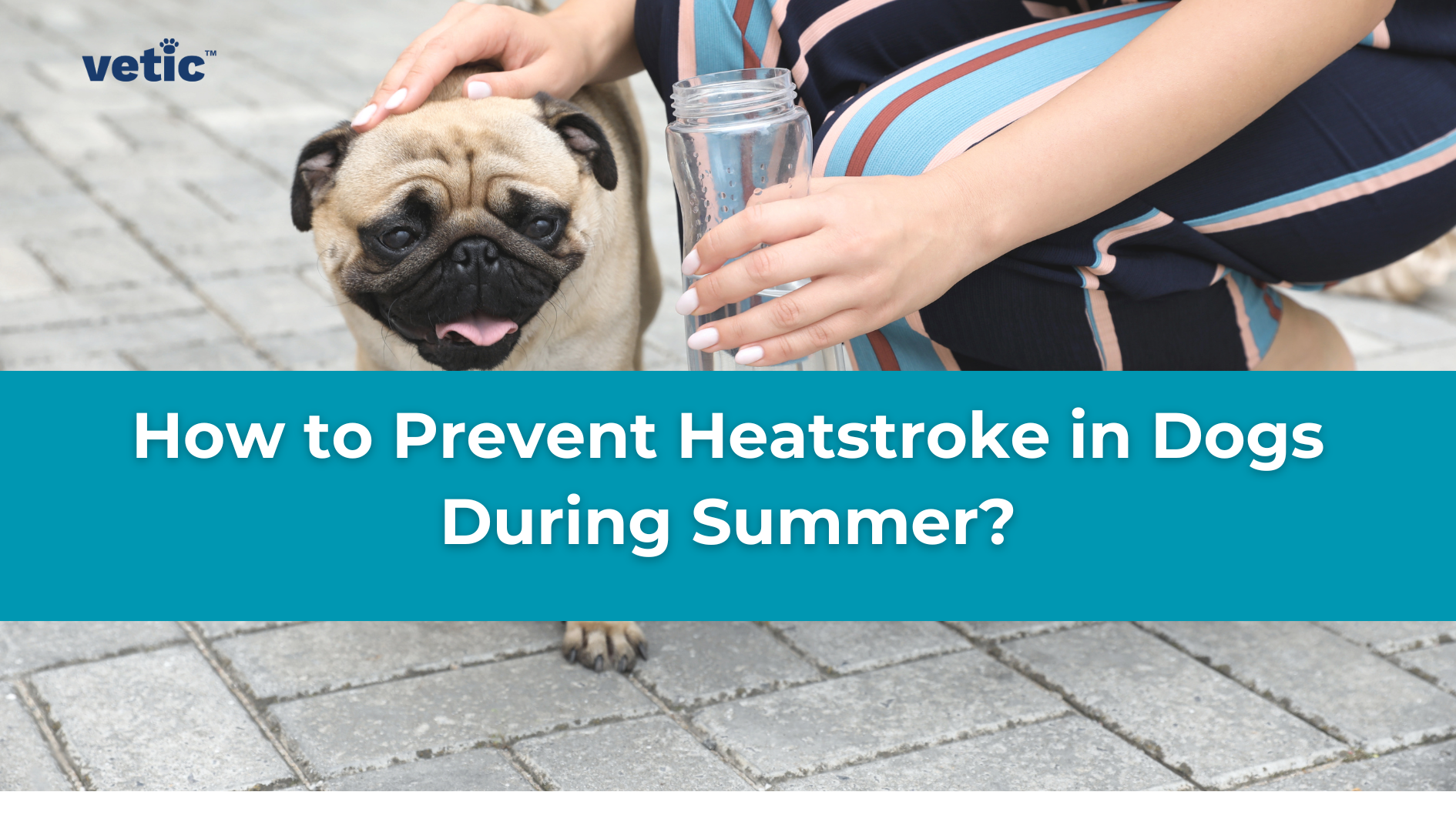 Photo of a pug with their pet parent holding a clear water bottle. The image has the caption "How to Prevent Heatstroke in Dogs". It has the Vetic logo on the top left corner. Flat-faced breeds, such as the pug are prone to heat strokes during the hotter days of summers.