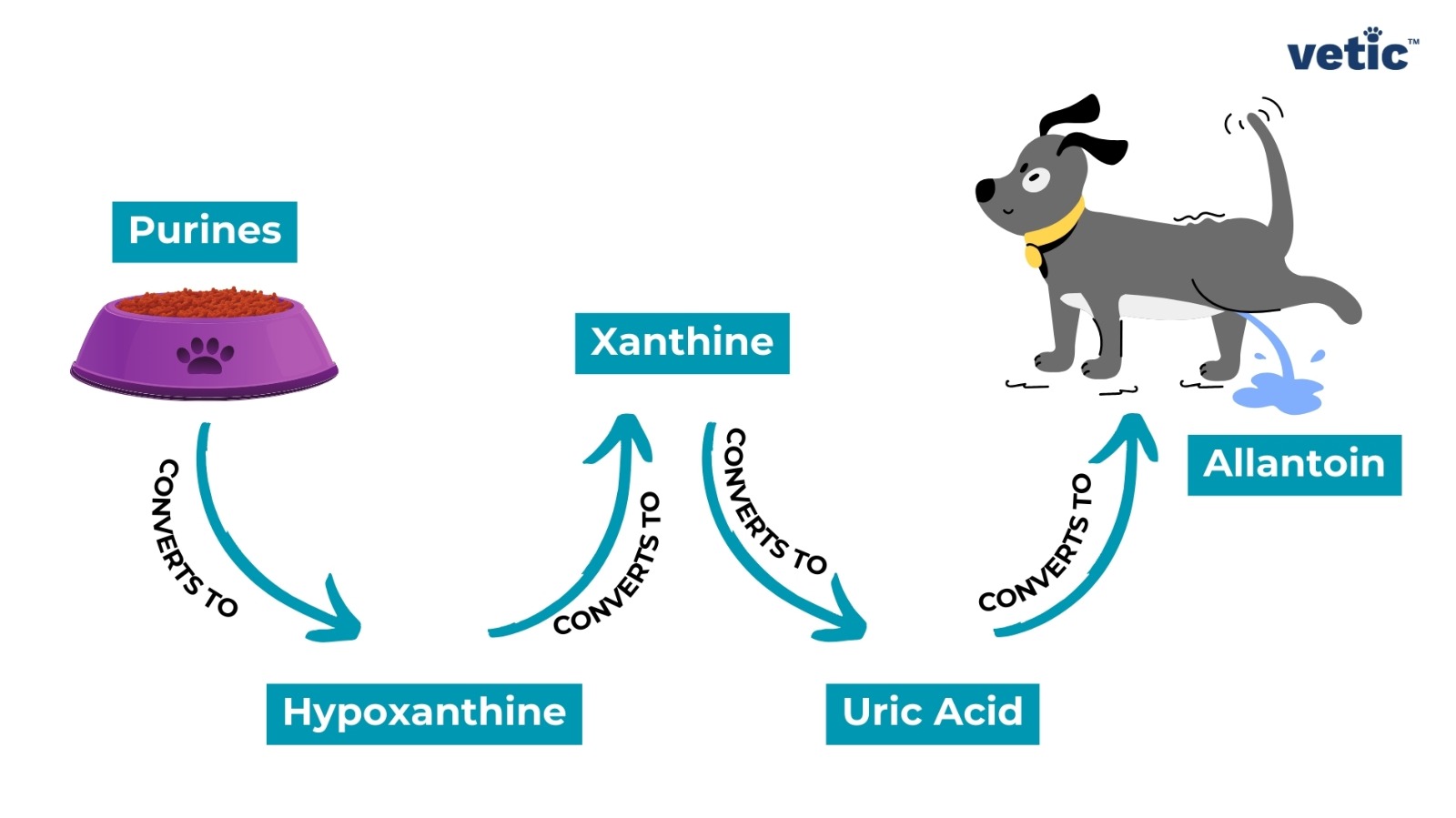 The image is an infographic on Uroliths in Dalmatians; explaining the metabolic process of converting purines to uric acid in dogs. On the left, there is a purple bowl filled with dog food labeled “Purines.” Arrows labeled “CONVERTS TO” show the conversion process from purines to hypoxanthine, then to xanthine, and then to uric acid, which is finally converted to Allantoin. “Hypoxanthine” and “Xanthine” are written in blue text boxes connected by arrows indicating their conversion sequence. On the right side of the image, there’s a cartoon depiction of a grey dog with a yellow collar. The dog appears to be peeing, representing the excretion of uric acid.