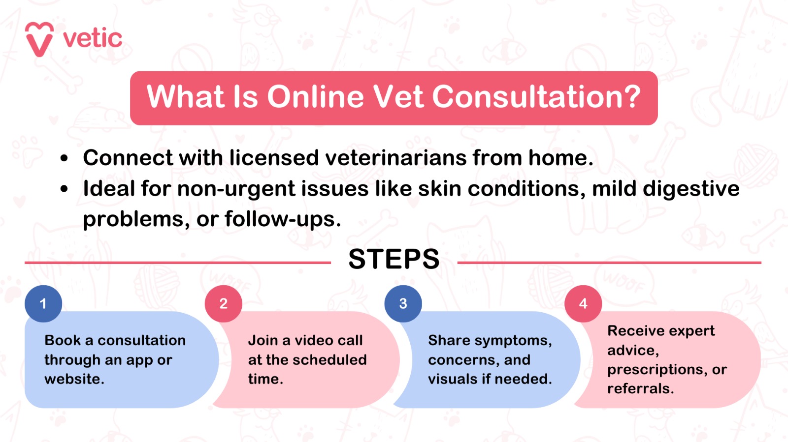 What Is Online Vet Consultation? Connect with licensed veterinarians from home. Ideal for non-urgent issues like skin conditions, mild digestive problems, or follow-ups. Steps: Book a consultation through an app or website. Join a video call at the scheduled time. Share symptoms, concerns, and visuals if needed. Receive expert advice, prescriptions, or referrals.